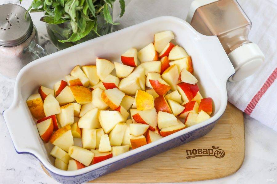 Яблоки промойте в воде, разрежьте на четыре части каждый плод и вырежьте семенные блоки. Нарежьте средними кубиками и выложите на дно формы для запекания. Форму смазывать ничем не нужно, яблоки выделят сок и будут тушиться в нем.
