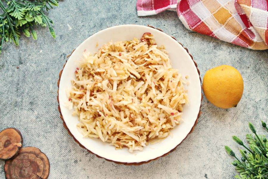 Разрежьте лимон пополам и из одной половинки выжмите сок. Полейте лимонным соком натертые яблоки и перемешайте.