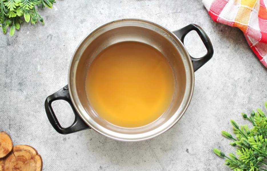 Сцеженную жидкость перелейте в кастрюлю, добавьте сахар и поставьте на медленный огонь. Доведите все до кипения и варите в течение пяти минут, перемешивая. Снимите с огня, закройте кастрюлю крышкой и полностью остудите.