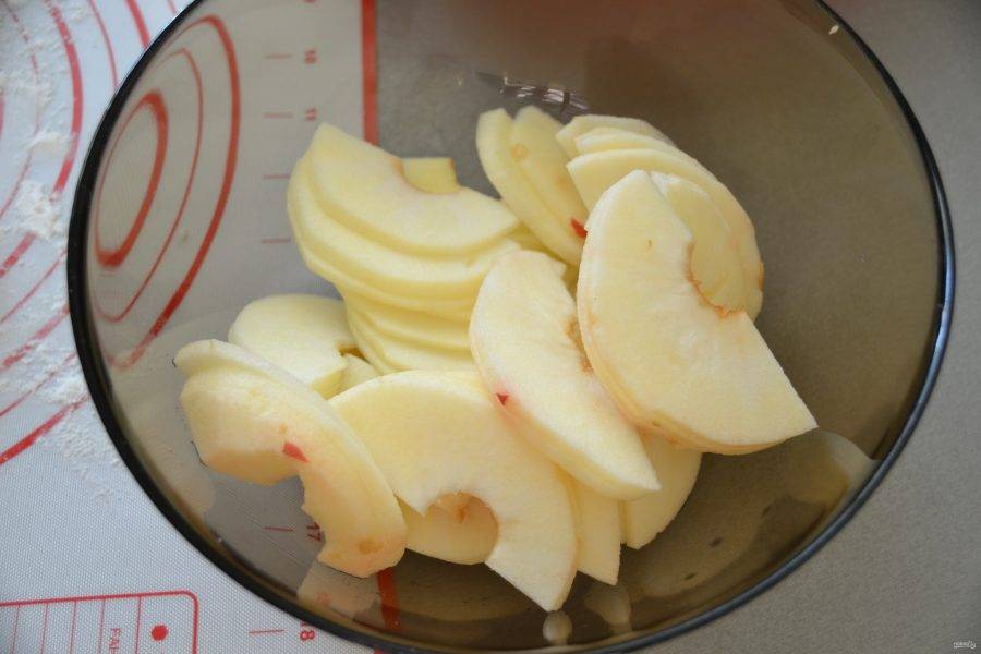 Яблоки очистите от сердцевинки и от кожуры, нарежьте тонкими пластинками-полукольцами.