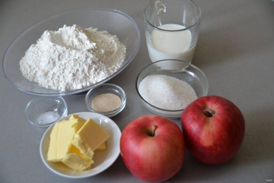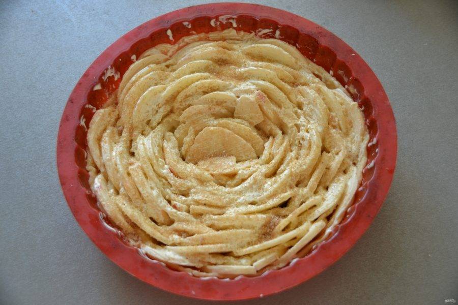 Подготовьте форму, слегка смажьте её сливочным маслом, выложите вдоль бортика полоску теста, следующим слоем полоску из яблочных долек срезом вниз и так до самого конца, до полного заполнения формы.