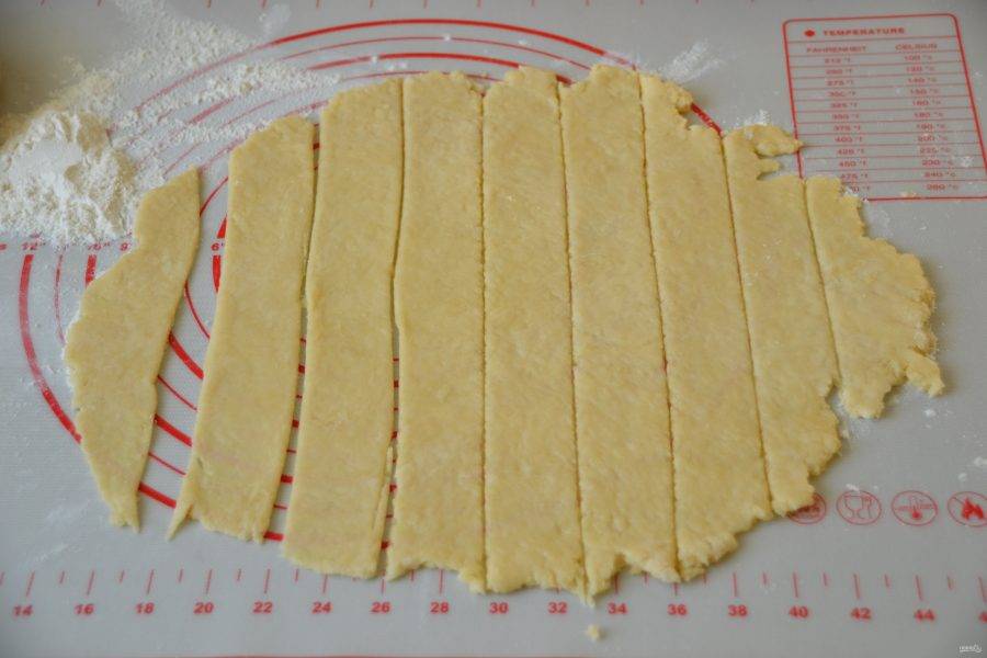 Разделите тесто на 2 части (так удобнее работать). Раскатайте в пласт и нарежьте полоски шириной 1,5-2 см.