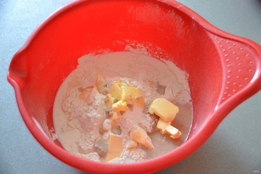 Добавьте кусочки сливочного масла, влейте дрожжевую смесь, замесите тесто. Это можно делать руками, а можно и миксером, как вам нравится.