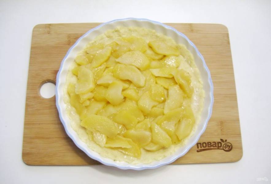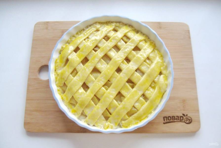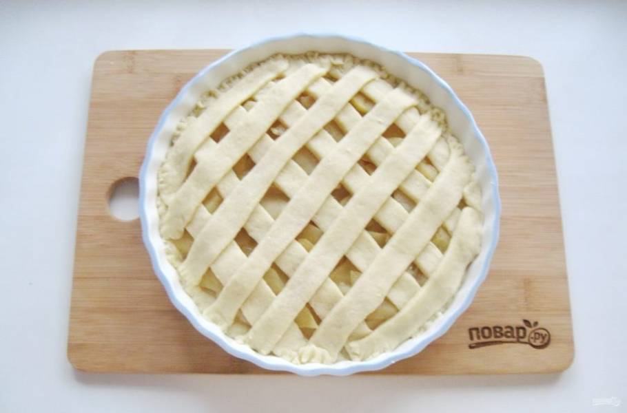 Вторую часть теста раскатайте в пласт, который нарежьте полосками шириной 1,5-2 см. Выложите полоски решеткой на яблоки.