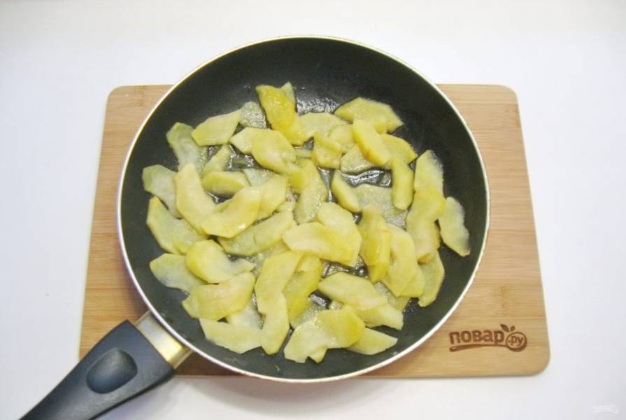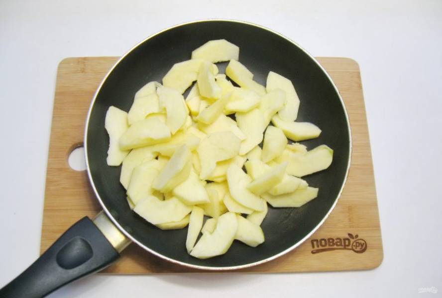Пока тесто в холоде, сделайте начинку. Яблоки помойте, очистите, удалите сердцевину и нарежьте пластинками. Выложите в сковороду, добавьте сливочное масло и сахар.
