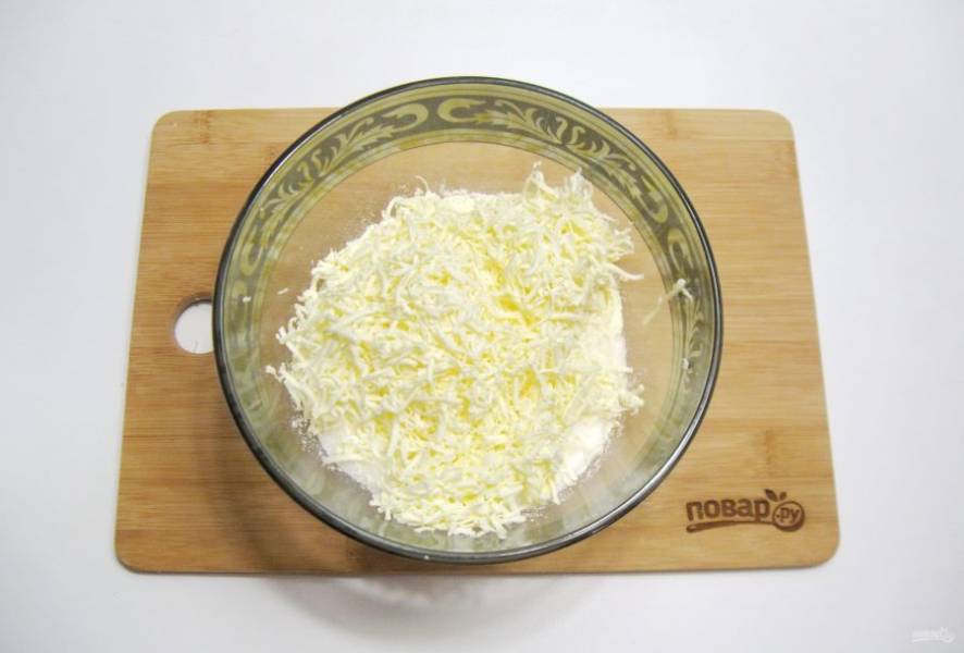 Натрите на терке холодное сливочное масло прямо в миску с мукой и сахаром.