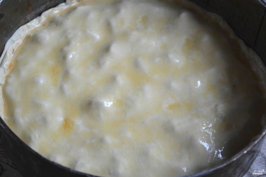 Раскатайте второй лист теста, накройте им пирог. Сверху смажьте взбитым яйцом.