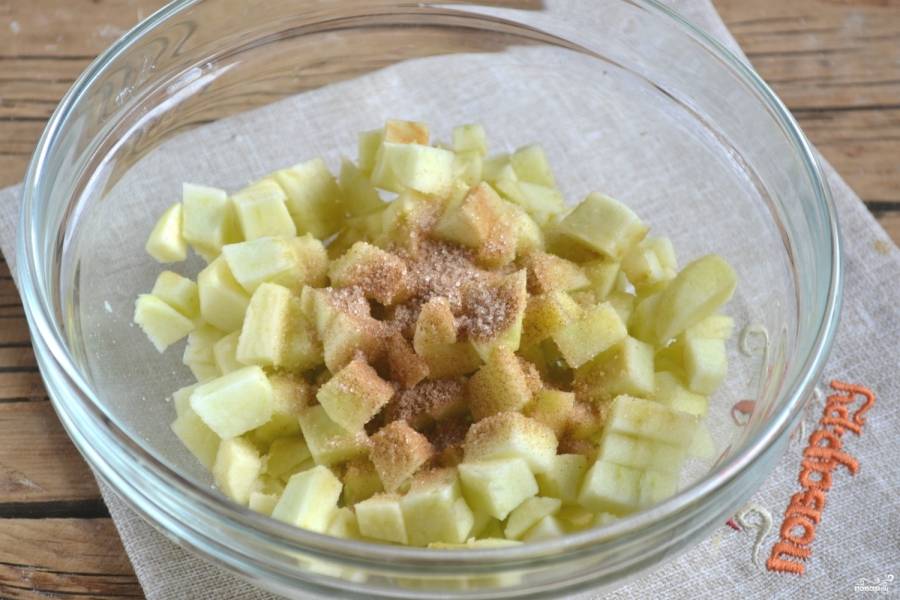 Посыпьте смесью сахара и корицы, перемешайте и отставьте в сторону.