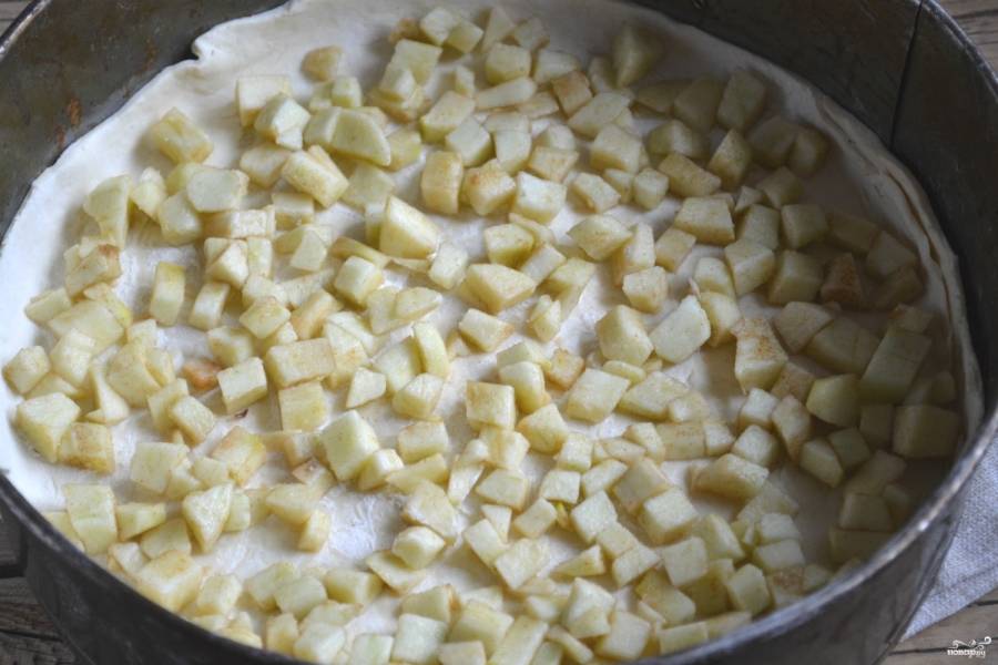 Раскатайте один лист теста, переложите его в форму для выпекания, лишнее отрежьте. Сверху положите подготовленные яблоки.