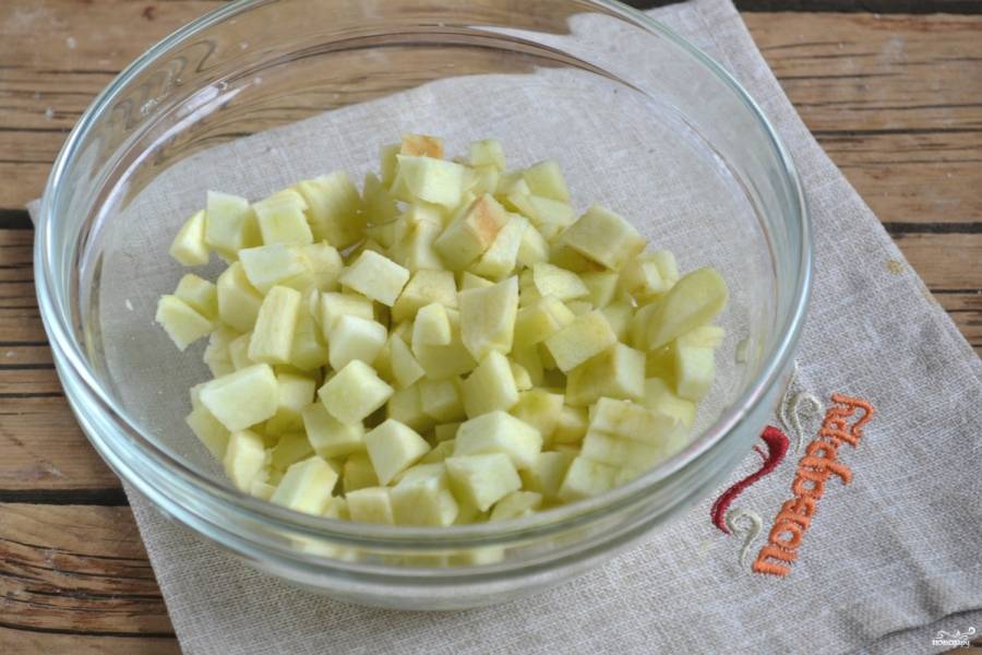 С яблок снимите кожуру, порежьте их на мелкие кубики.