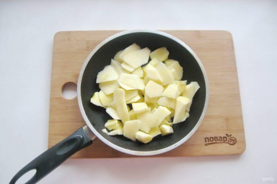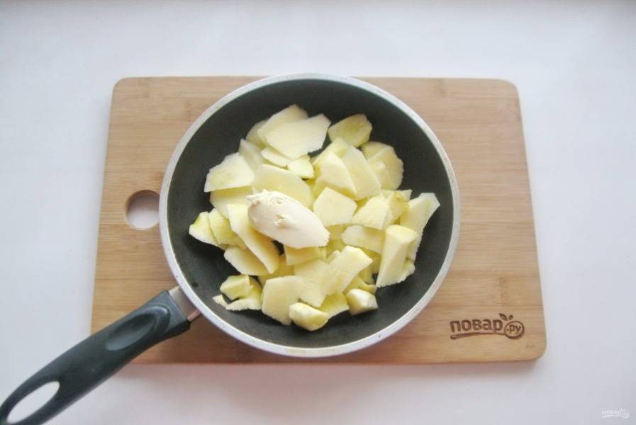 Яблоки очистите, удалите сердцевину и нарежьте кусочками. Выложите в сковороду.