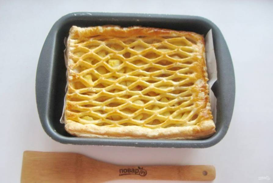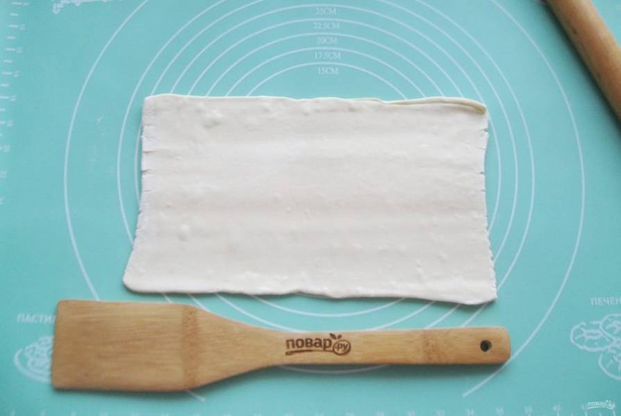 Слоеное тесто разморозьте. Немного раскатайте один пласт теста.