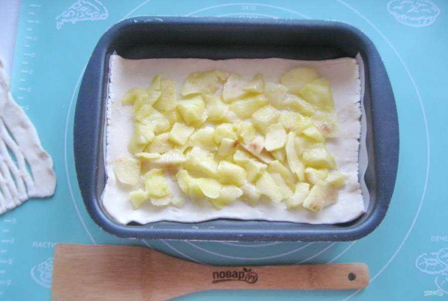 Тесто без разрезов выложите в форму для выпекания. Разложите на тесто яблоки.
