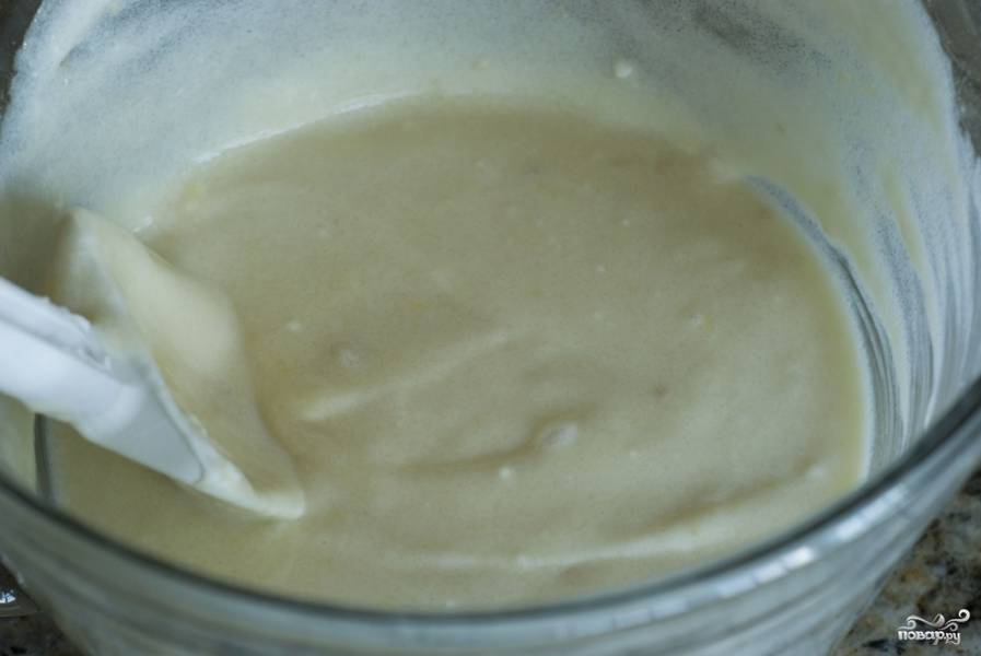 В большой миске смешиваем сметану, яйцо, 1/4 стакана муки, 1/4 стакана сахара, соль и ванильную эссенцию.