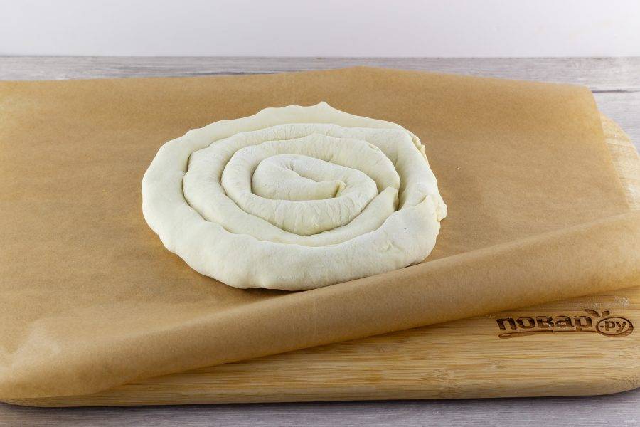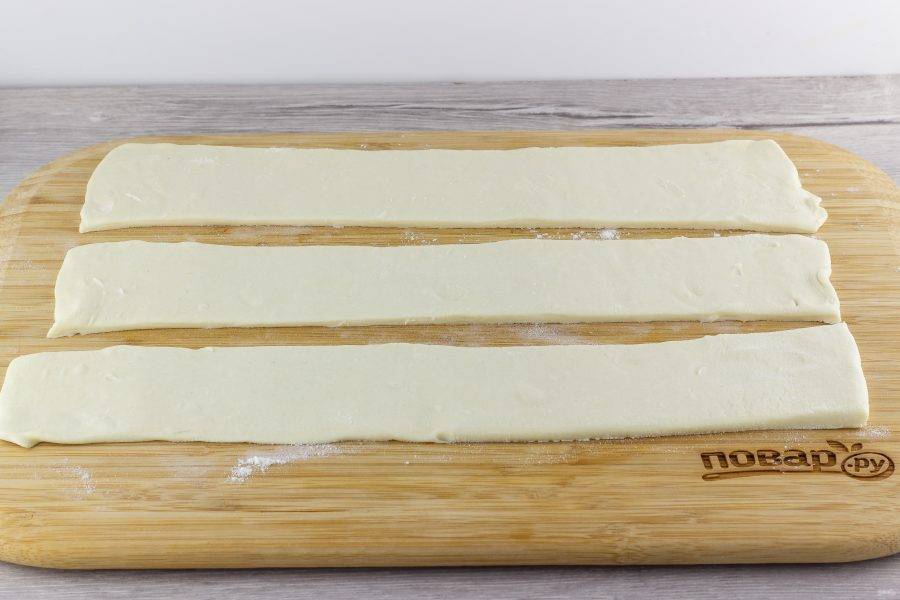 Тесто раскатайте в одну сторону, чтобы вытянулось примерно в 1,5-2 раза.