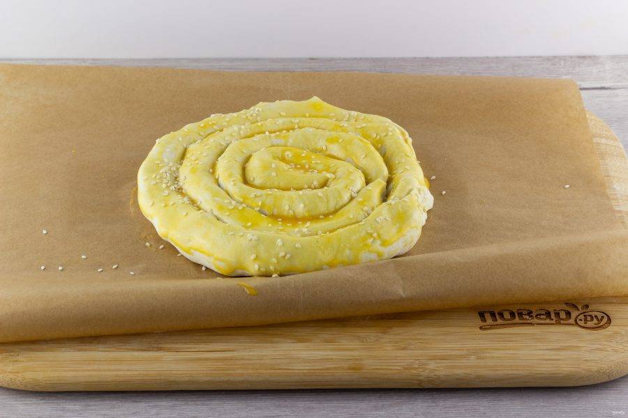 Смажьте желтком и посыпьте кунжутом. Поставьте запекаться на 25-30 минут при температуре 180 градусов. Готовый пирог остудите и приглашайте всех к столу.
