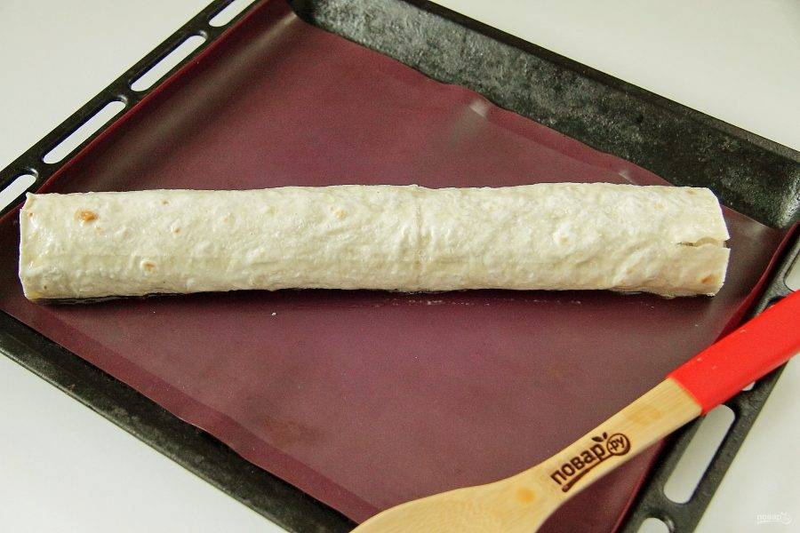 Заверните лаваш с начинкой рулетом. Перенесите аккуратно рулет на противень, застеленный пергаментом или силиконовым ковриком и смажьте поверхность оставшейся яичной смесью. Выпекайте при 190 градусах около 15 минут.