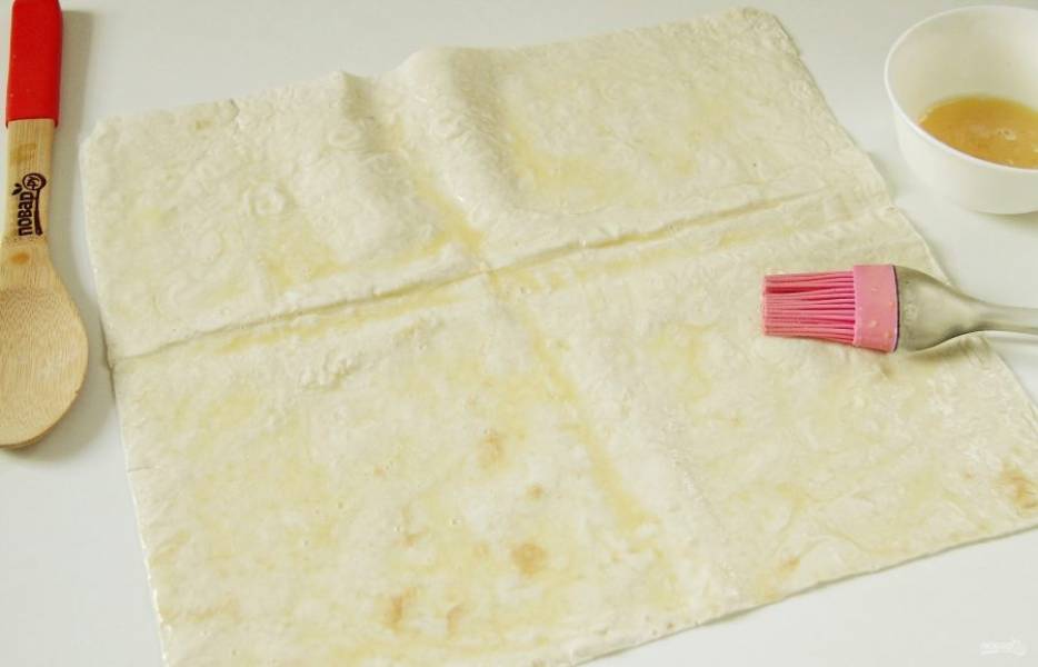 Смажьте лаваш яичной смесью при помощи кулинарной кисти.