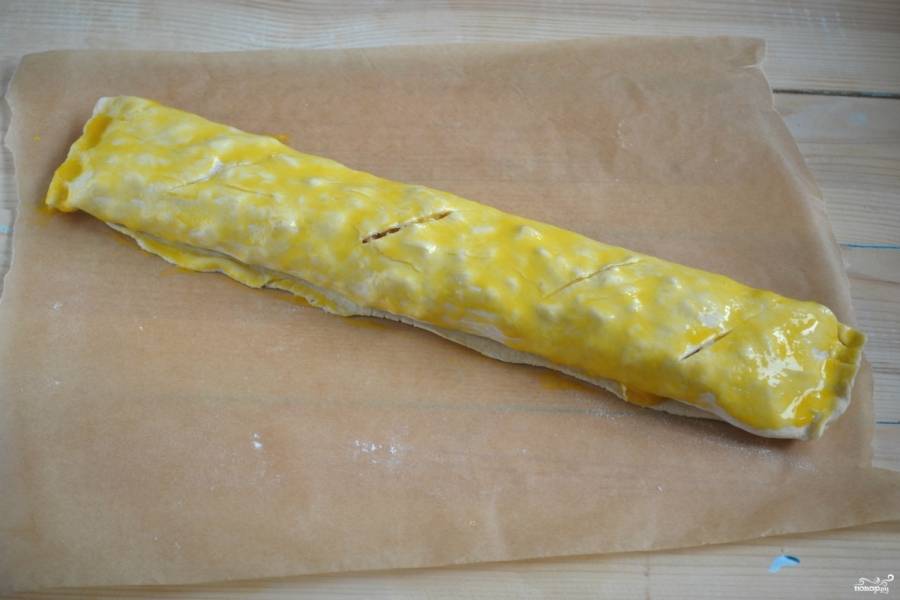 Сделайте сверху несколько надрезов, смажьте рулет яйцом.
