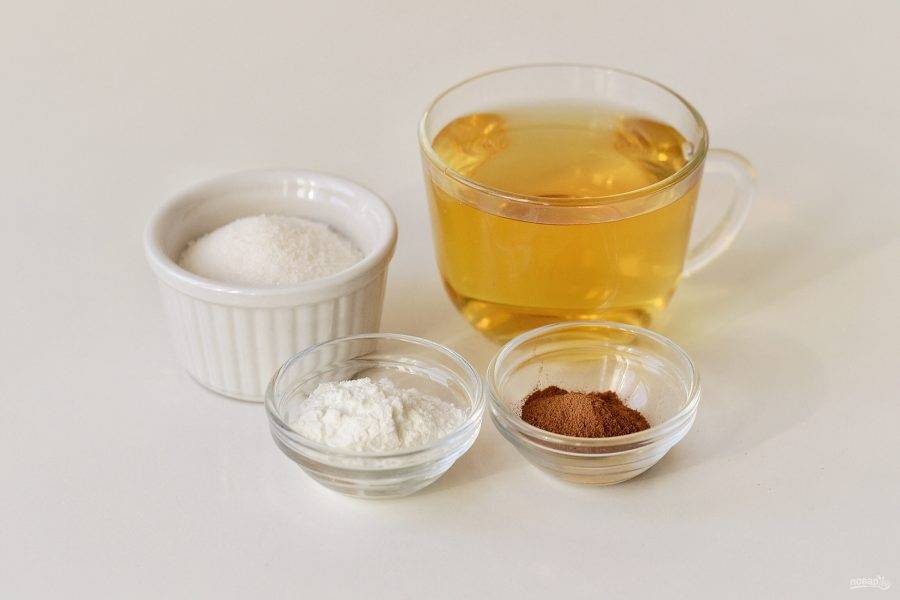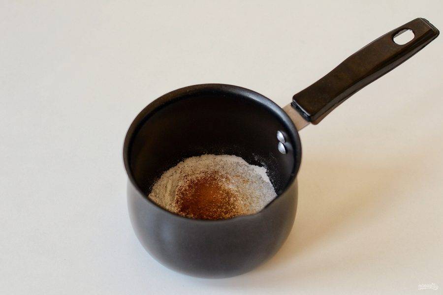 Смешайте в сотейнике крахмал, корицу, сахар и мускатный орех.