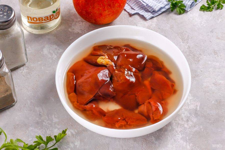 Куриную печень промойте в воде, срежьте с нее жилы и пленки.