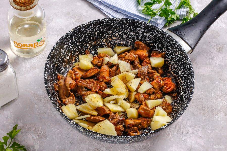 Нарежьте яблочную мякоть кубиками, удалив семена. Добавьте ее на сковороду к печени и обжарьте все еще 3-5 минут. Посолите и поперчите.