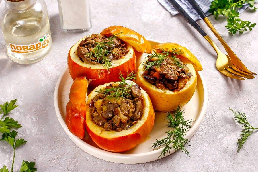 Выложите внутрь каждого яблока по 0,5 ч.л. майонеза любой жирности и нафаршируйте их обжаренной печенью с яблоками.