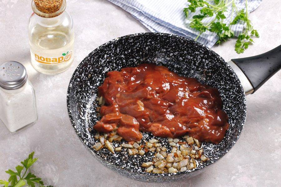 Нарежьте половину луковицы мелким кубиком и обжарьте примерно 2-3 минуты в растительном масле на сковороде. Печень нарежьте мелкими кусочками и добавьте в емкость к луку. Сделайте нагрев минимальным и обжарьте печень примерно 5-6 минут.