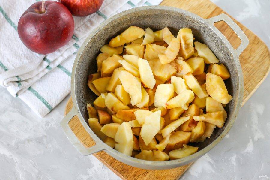 Яблоки очистите от кожуры, промойте в воде и срежьте с очищенных фруктов всю мякоть. Кожуру лучше всего не использовать, так как на сегодняшний день практически все яблочные плоды обрабатывают парафином. Выложите нарезку мякоти в ковш, казан или сотейник.