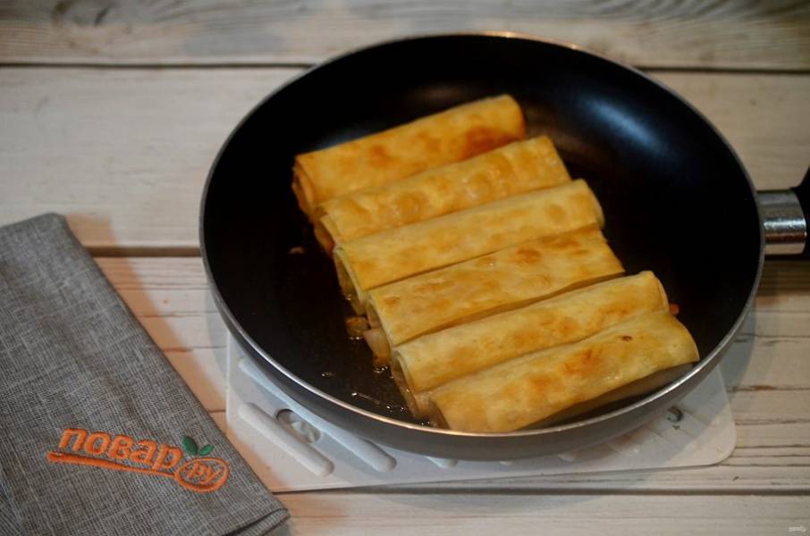 6. Разогрейте масло в сковороде и обжарьте трубочки сначала швом вниз, а затем со всех сторон до хрустящего состояния.