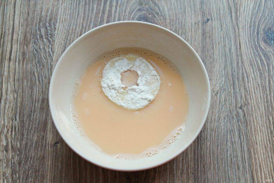 В миску разбейте яйцо, влейте воду и взбейте вилкой до однородности. Выложите в массу обваленные кружочки яблок, чтобы они полностью покрылись ей.