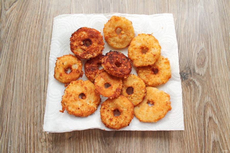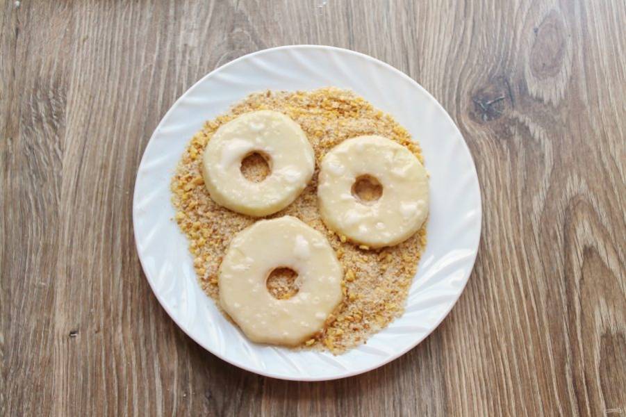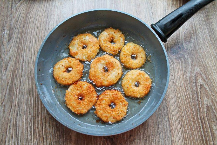 Переложите колечки в панировку и полностью покройте их.