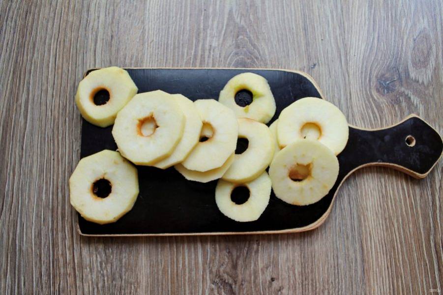 Яблоки вымойте, обсушите и очистите от кожуры. Удалите сердцевину с семечками и нарежьте яблоки тонкими кружочками.