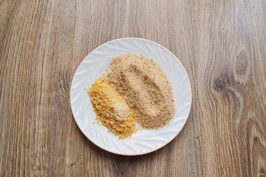 Кукурузные хлопья сложите в чашу блендера и измельчите. Смешайте панировочные сухари и измельченные кукурузные хлопья.