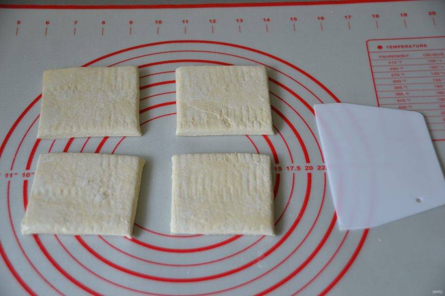Раскатайте каждый кусочек теста в квадрат, размером достаточным, чтобы завернуть в него яблоко.