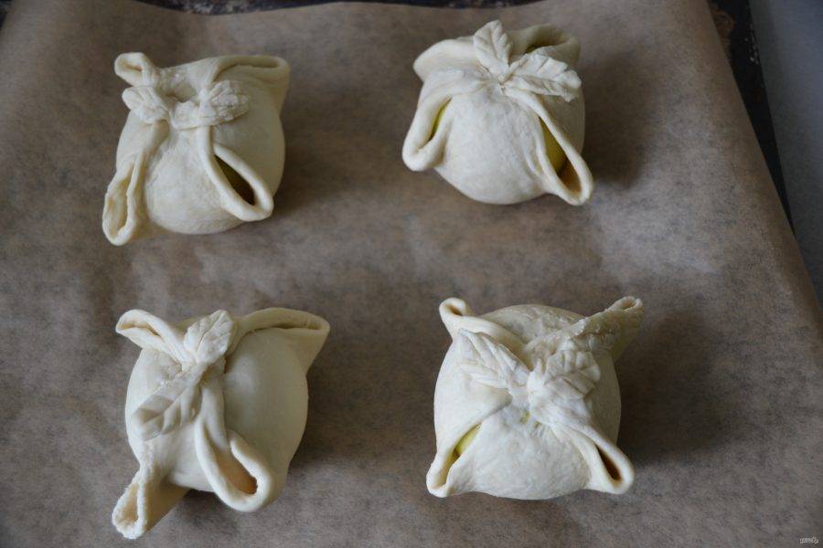 Выложите заготовки на лист для выпечки, закрепите "листочки" из теста.