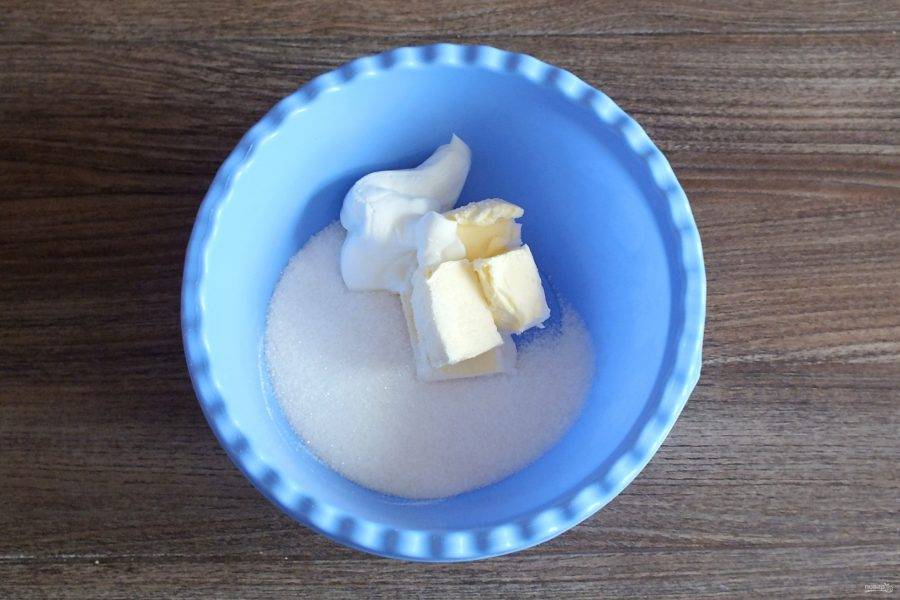 В чаше соедините 180 грамм сахара, сметану, мягкое сливочное масло. Перемешайте.