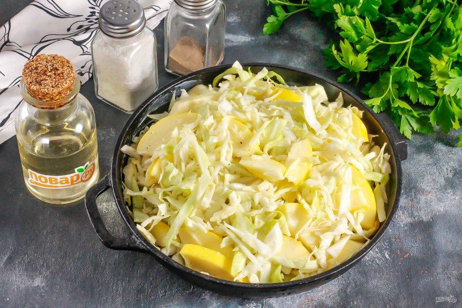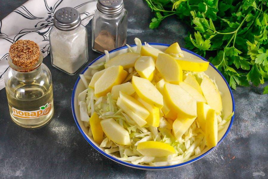 Разогрейте духовку до 180 градусов. Промойте яблоки и нарежьте их четвертинками. Срежьте семенные блоки и нарежьте мякоть ломтиками. Добавьте к капустной нарезке.