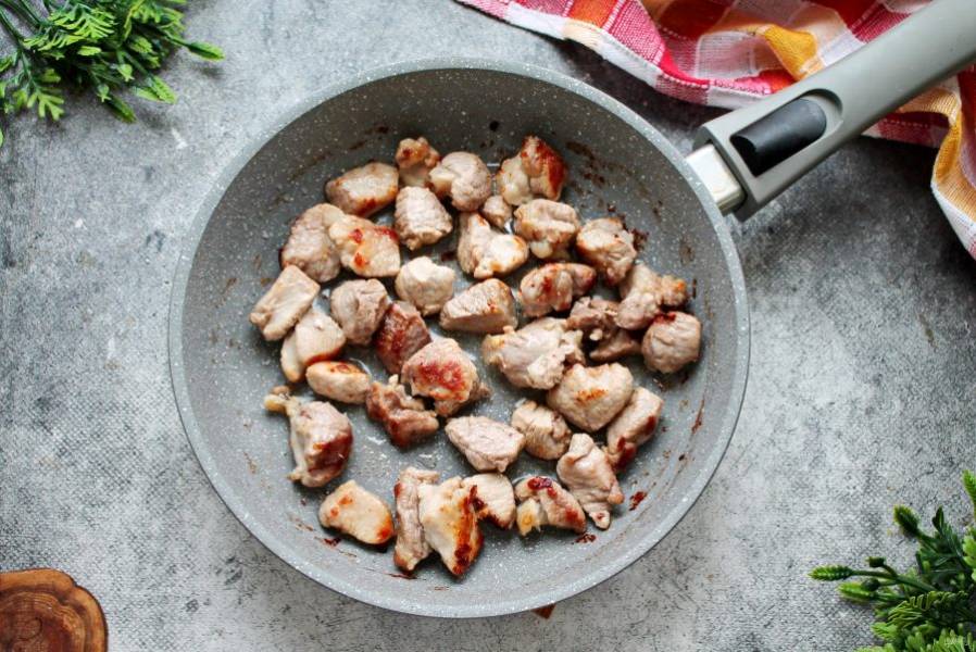 Свинину сполосните и полностью обсушите бумажным полотенцем. В сковороду налейте растительное масло, поставьте на сильный огонь и разогрейте. Порежьте мясо на средние кусочки и выложите в сковороду. Обжаривайте в течение 10 минут, перемешивая. Жидкость должна выпариться, а кусочки обжариться до румяной корочки.