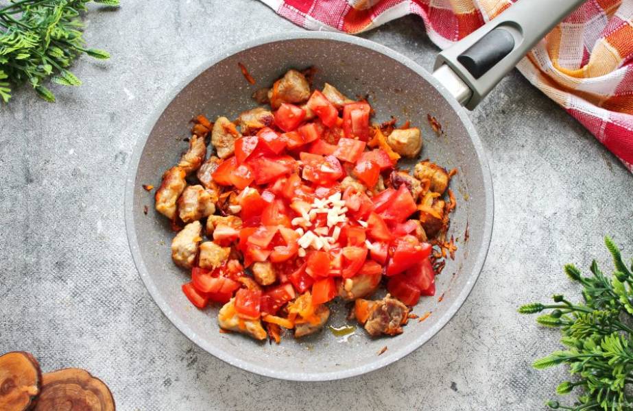 У томатов вырежьте плодоножки и порежьте средним кубиком. Чеснок измельчите и вместе с помидорами выложите в сковороду к мясу и остальным овощам. Все посолите, поперчите и тушите на медленном огне в течение 5-6 минут, перемешивая.