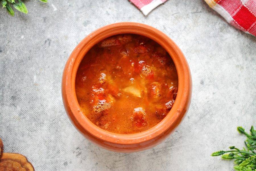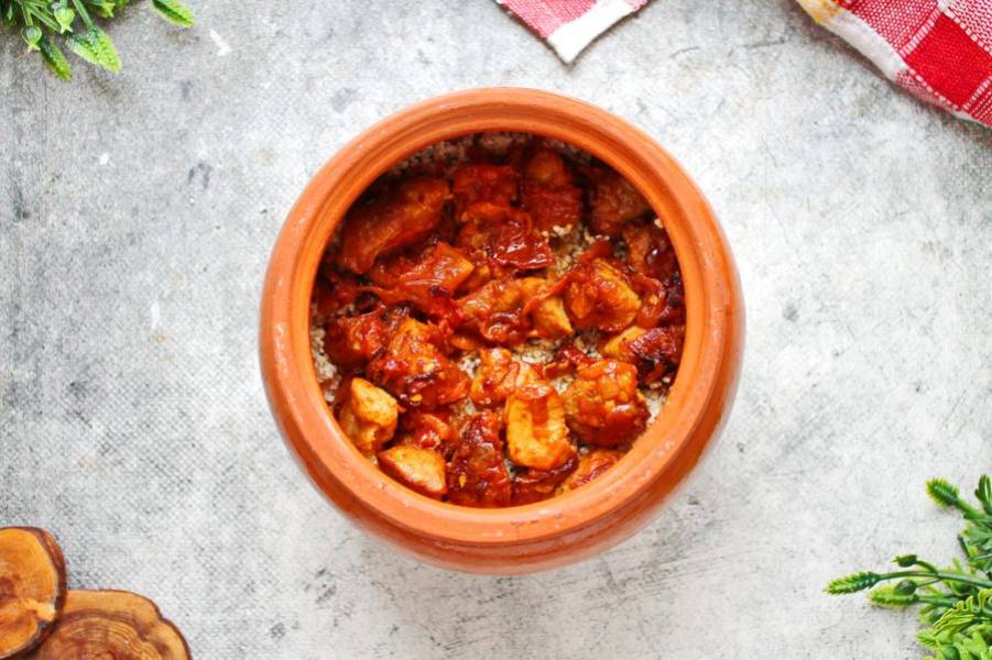 На крупу разложите оставшиеся овощи с мясом. Масса должна заполнить горшок на 3/4 высоты.