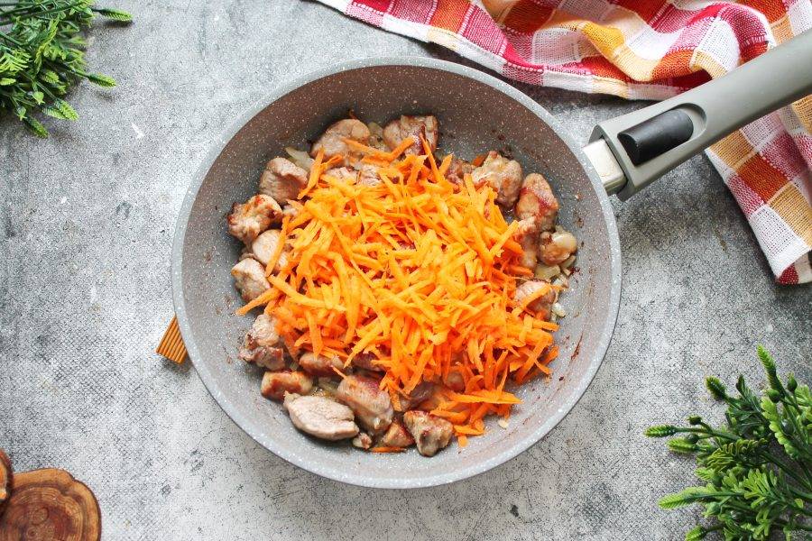 Морковь натрите на крупной или средней терке и добавьте в сковороду. Обжаривайте все еще 3 минуты, перемешивая.