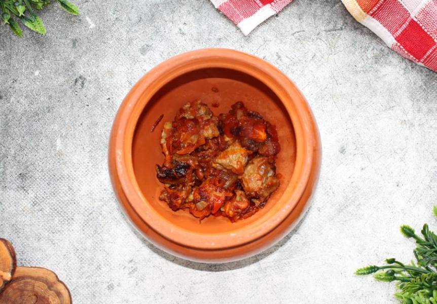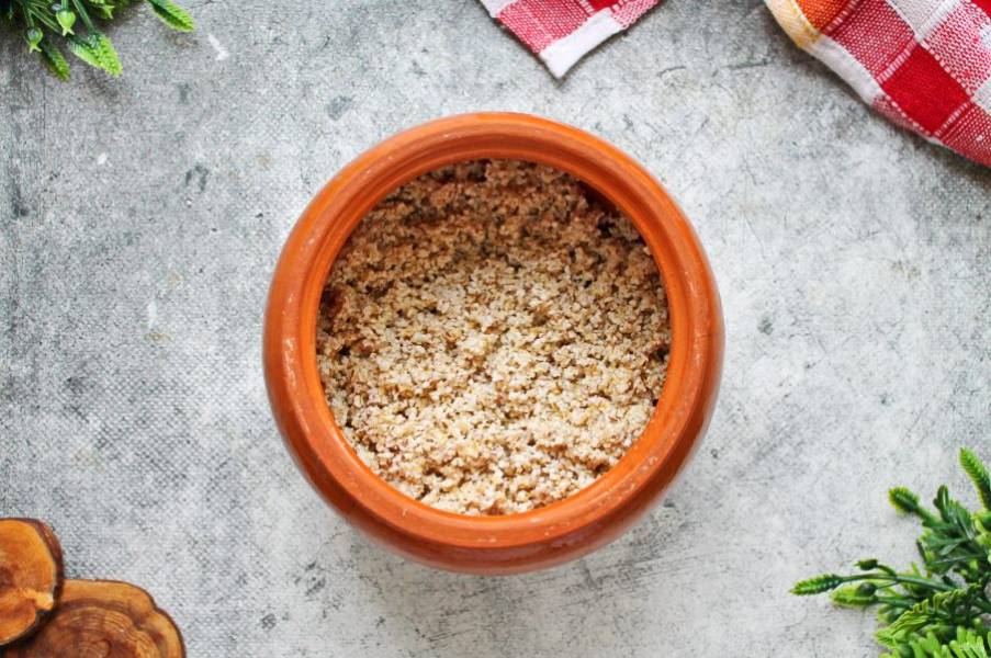 Ячневую крупу промойте и переложите в горшочек поверх мяса.