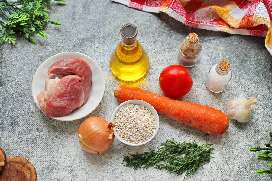 Подготовьте все необходимые ингредиенты для приготовления ячневой каши в горшочке. Морковь, репчатый лук, чеснок почистите, все овощи вымойте.