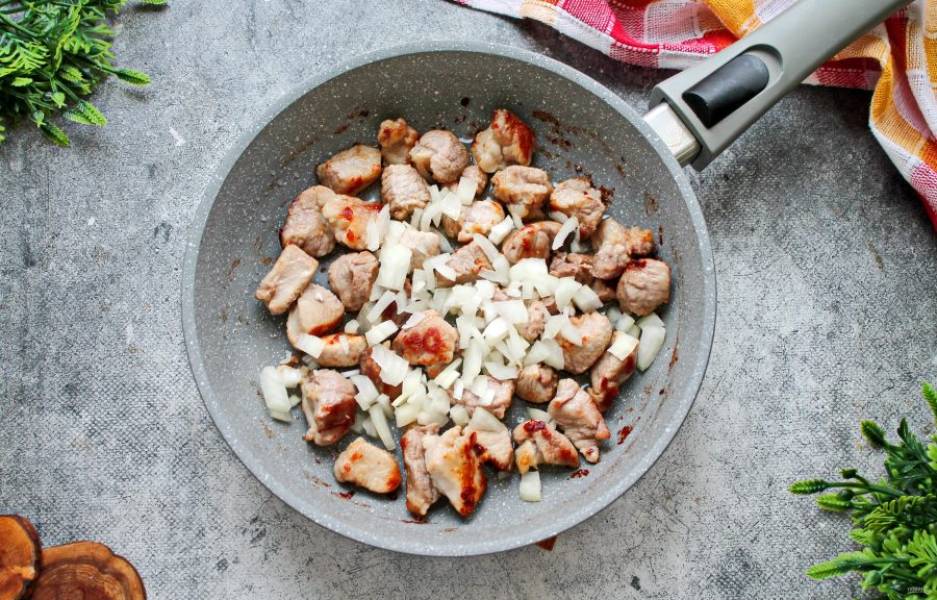 Репчатый лук порежьте кубиком, выложите в сковороду с обжаренным мясом. Убавьте огонь до среднего и обжаривайте все еще в течение 3 минут, перемешивая.