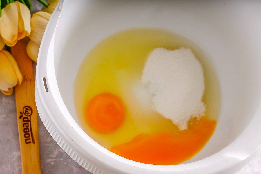 Вбейте куриные яйца в чашу кухонного комбайна или в глубокую емкость, если решите использовать миксер. Всыпьте 60 грамм сахара и взбейте примерно 3-4 минуты.