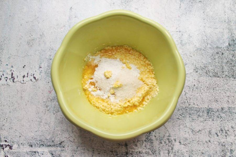 Яйца разбейте в миску, добавьте мягкое масло, сахар и щепотку соли. Взбейте до однородности. Муку смешайте с разрыхлителем и ванильным сахаром, всыпьте в миску.