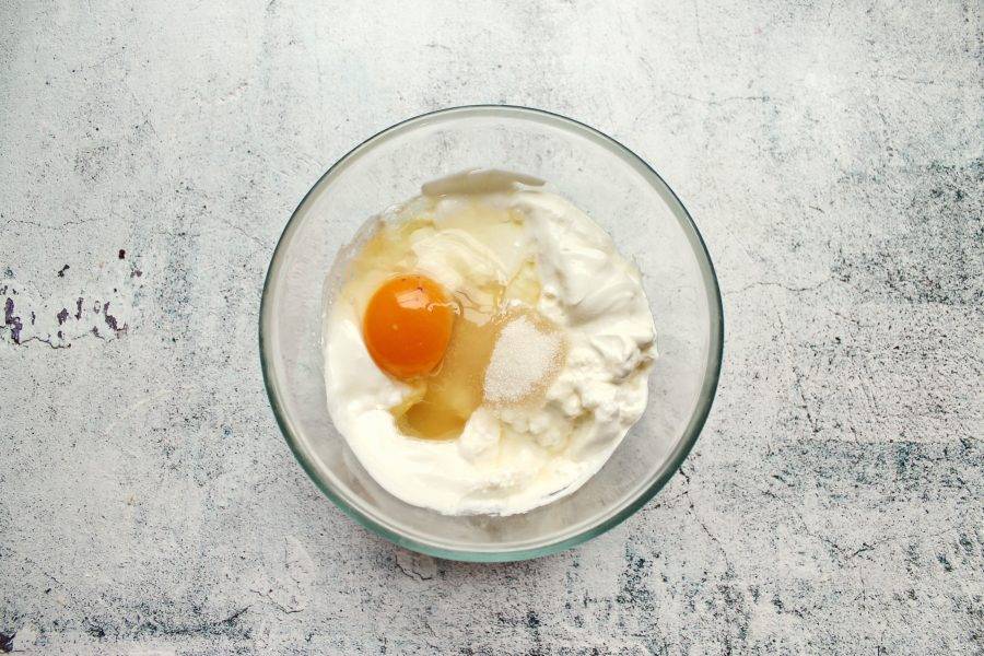 В миску выложите маскарпоне, сметану, сахар и разбейте яйцо. Все хорошо взбейте до однородности.