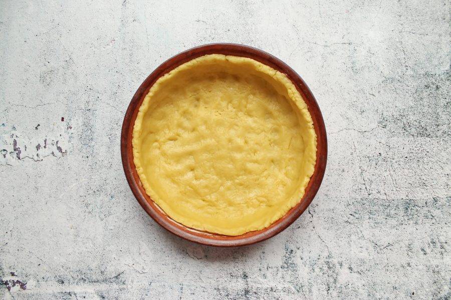 Тесто раскатайте в круг и выложите в форму диаметром 18 сантиметров, сделав до верха бортики. Наколите вилкой тесто в основании.