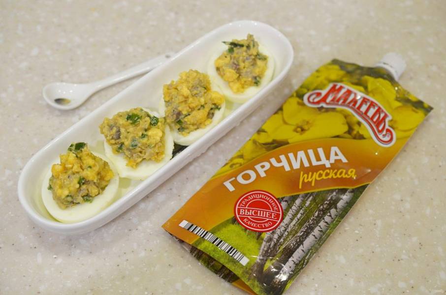 4. Добавьте желтки и горчицу МахеевЪ. Перемешайте.